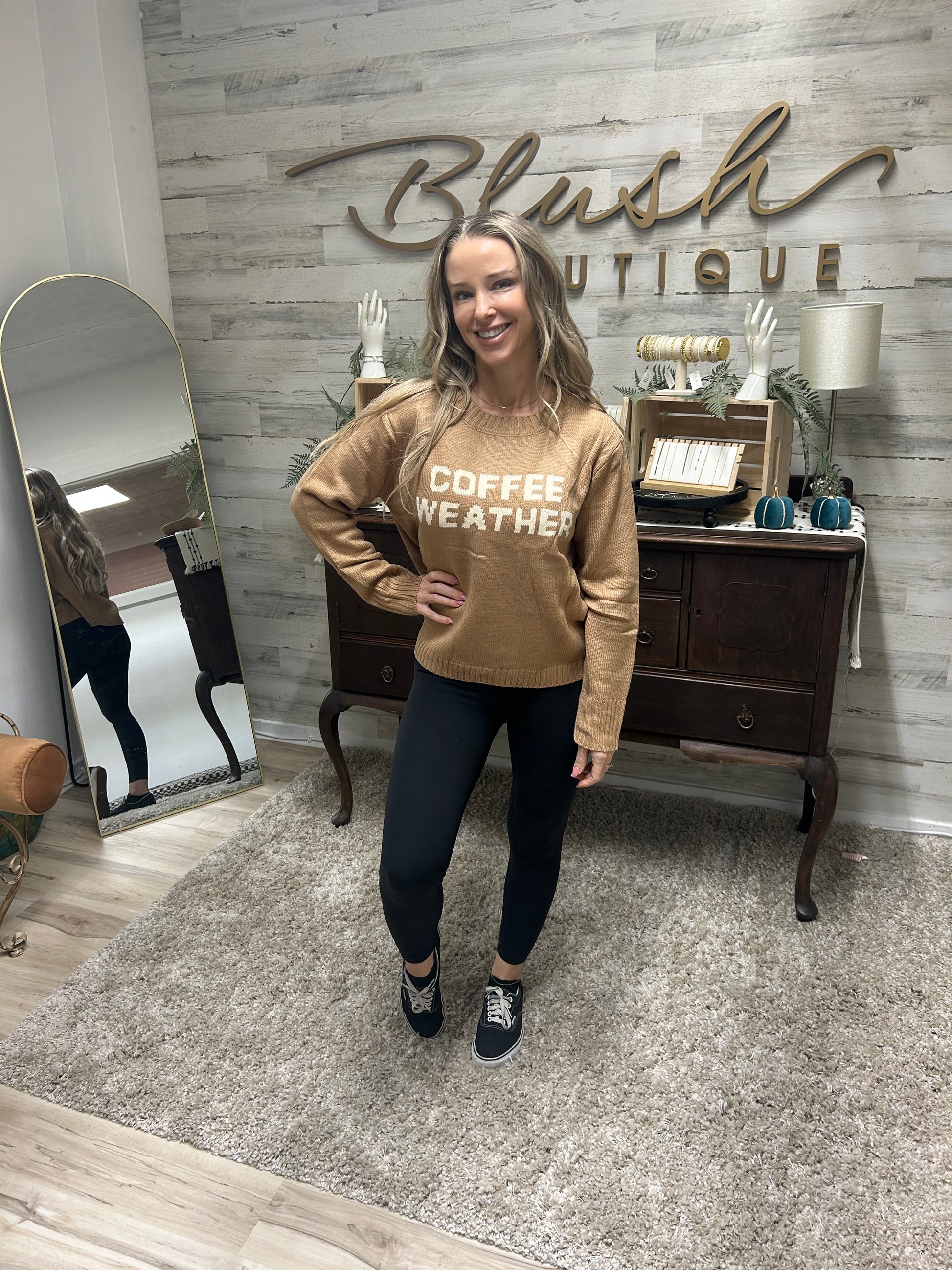 Cozy up in the season’s softest statement piece! This warm camel knit sweater features a relaxed fit and bold “COFFEE WEATHER” graphic that’s perfect for casual fall days, coffee runs, or lounging at home. Designed with drop shoulders, ribbed cuffs and hem for a comfortable, easygoing vibe.