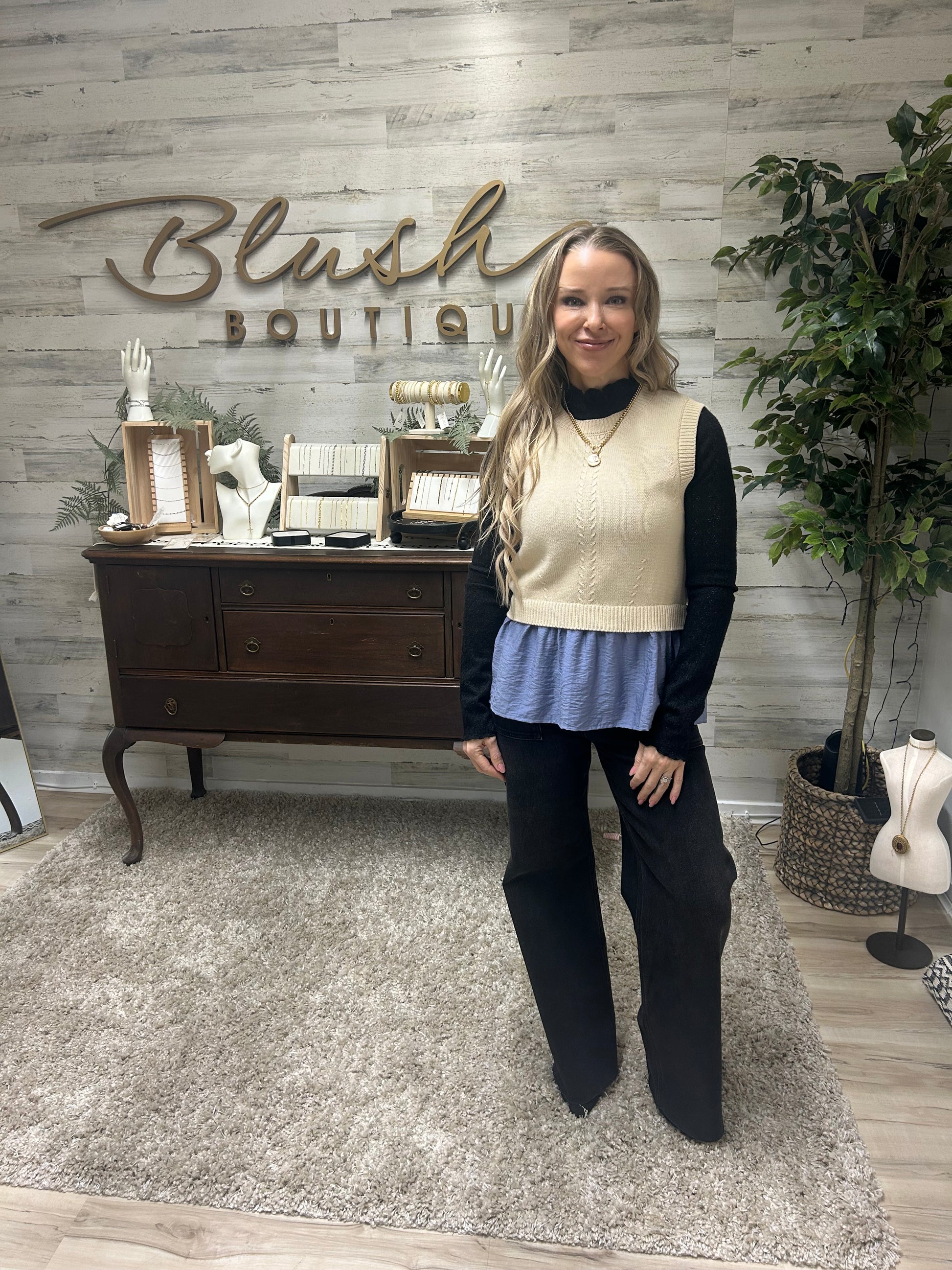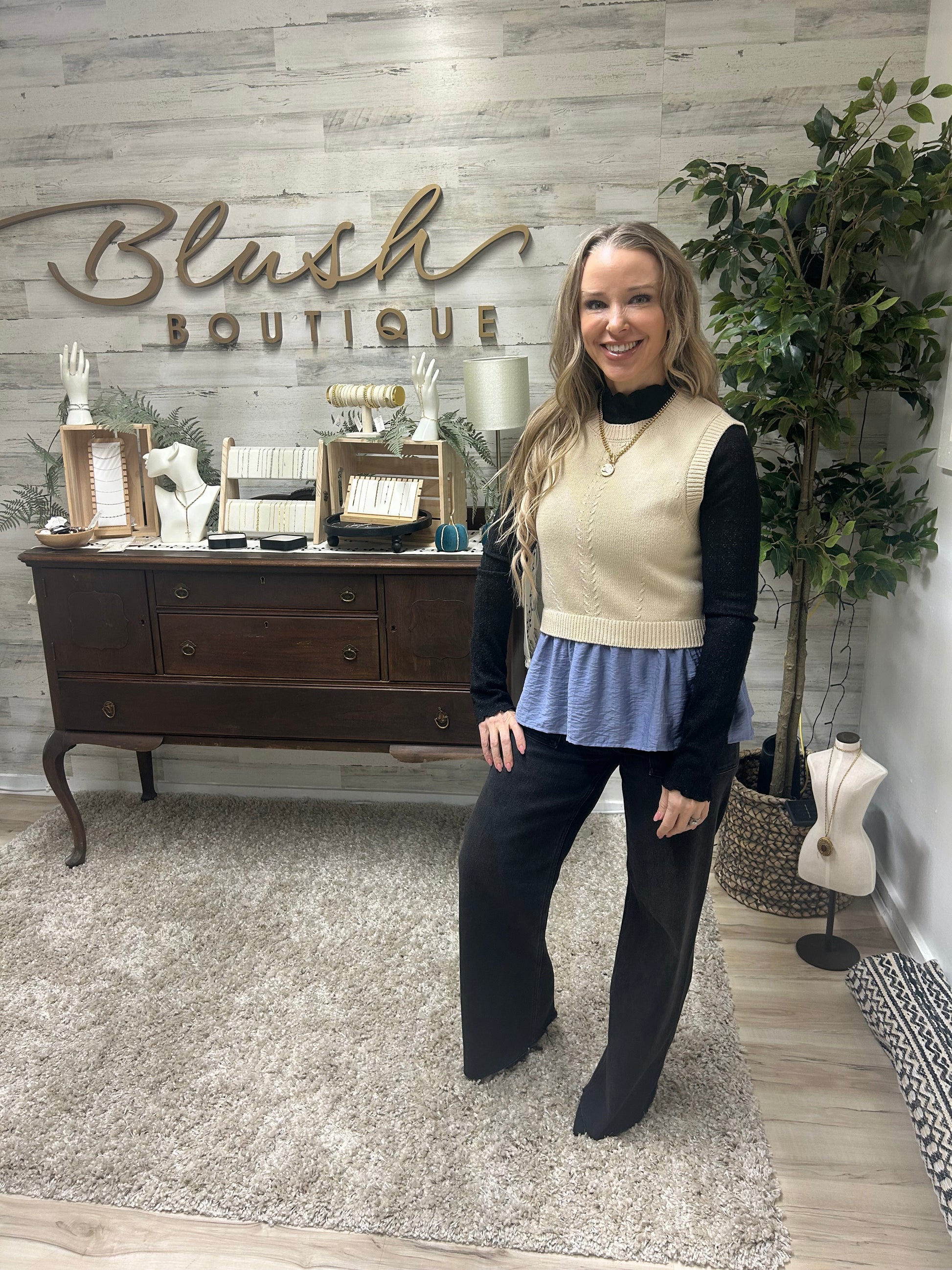 Our Denim Days Layered Knit Top blends cozy and casual in one chic piece. Featuring a soft sleeveless knit sweater design with a lightweight, flowy denim accent for a layered look without the bulk. Perfect for transitioning seasons - pair it with wide leg denim or sleek black trousers for effortless style that's polished yet playful.