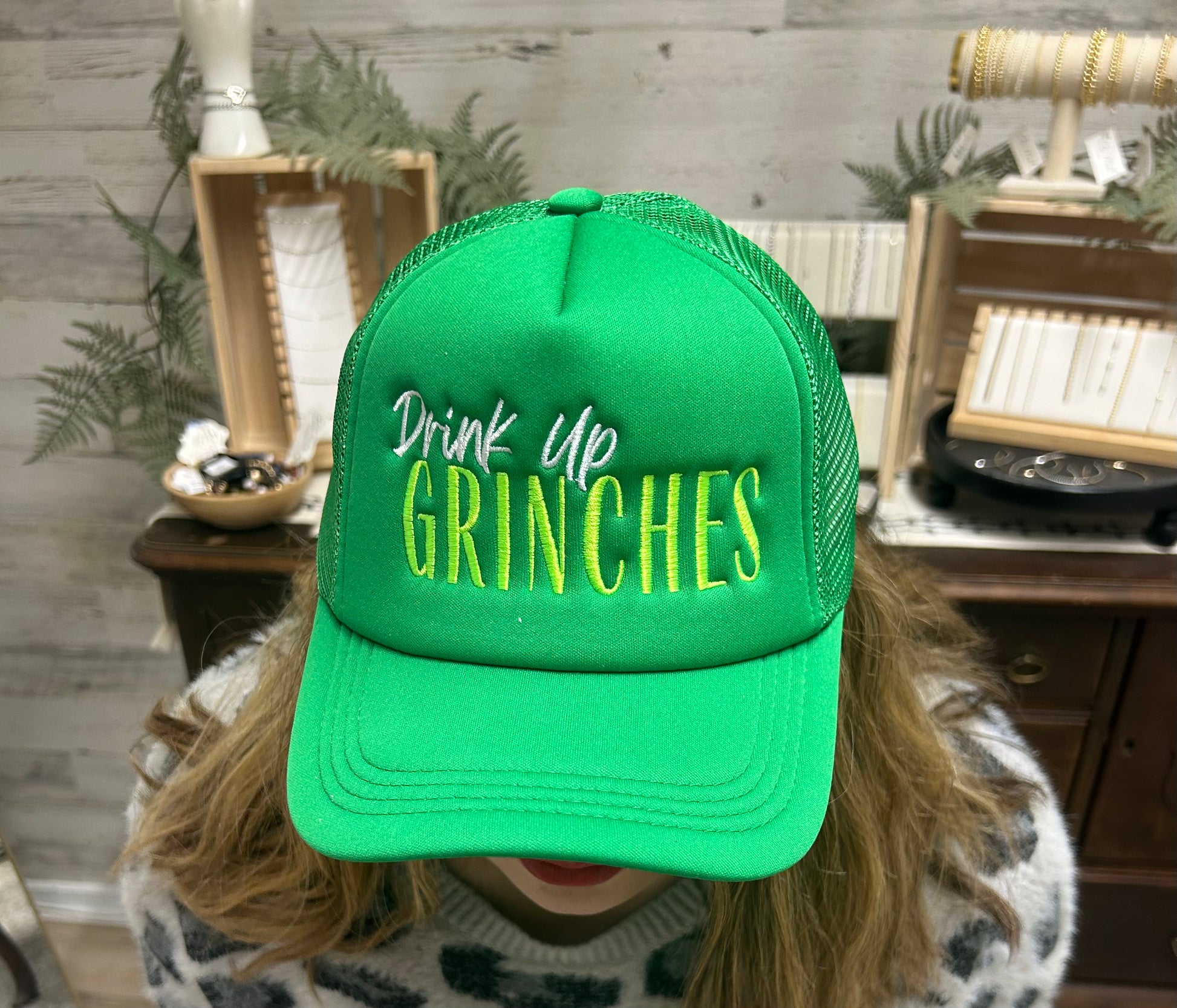Our Drink Up Grinches trucker hat features bright green fabric with playful embroidered lettering in white and lime, giving it the perfect festive flair. Lightweight, adjustable, and made for merry moments — from holiday parties to cozy cocktail nights.