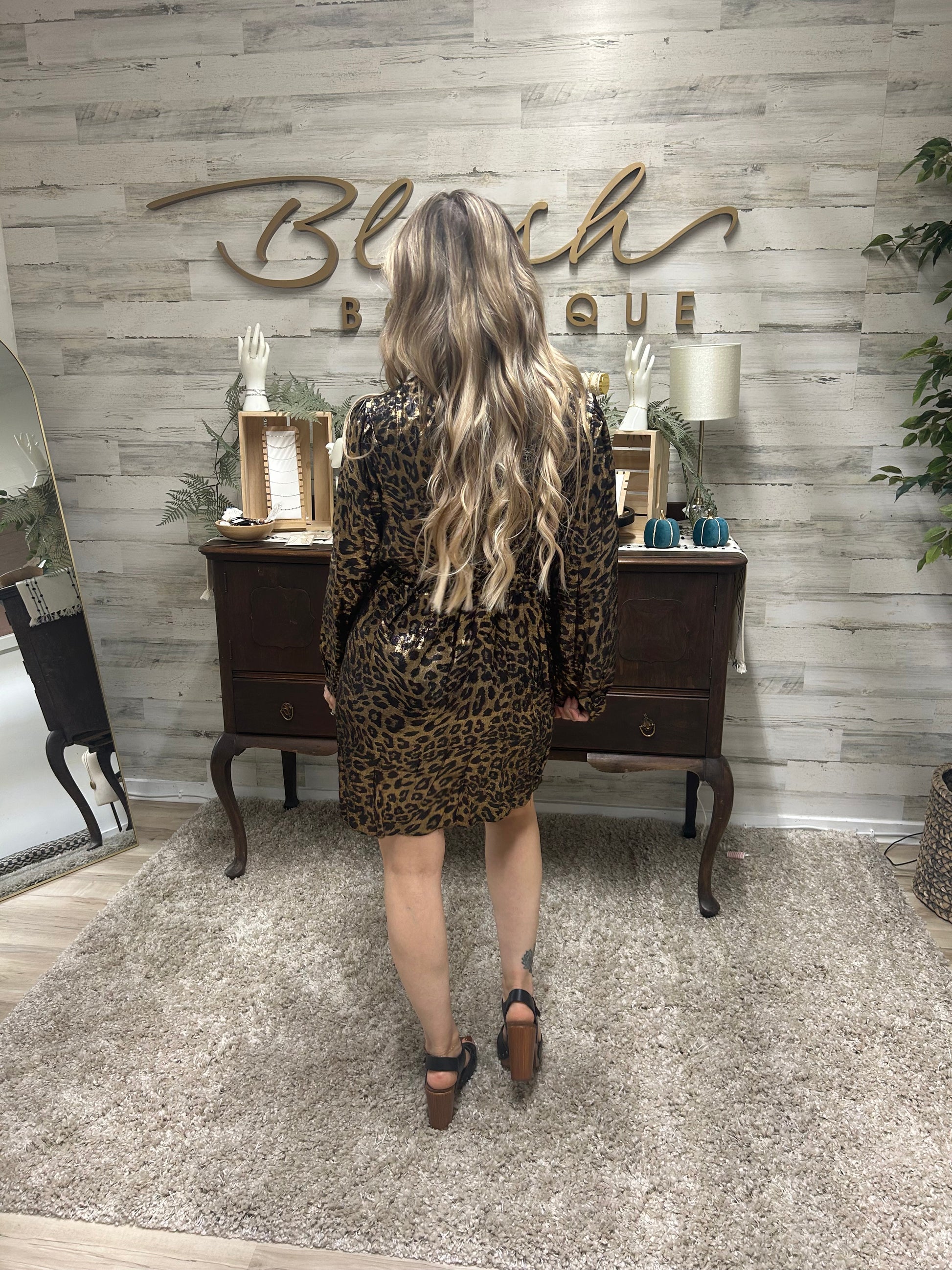 Make a fierce statement in this stunning wrap-style leopard dress with a metallic sheen! The flattering fit, bold print, and luxe shine make it perfect for a night out, holiday party, or any event where you want to stand out.