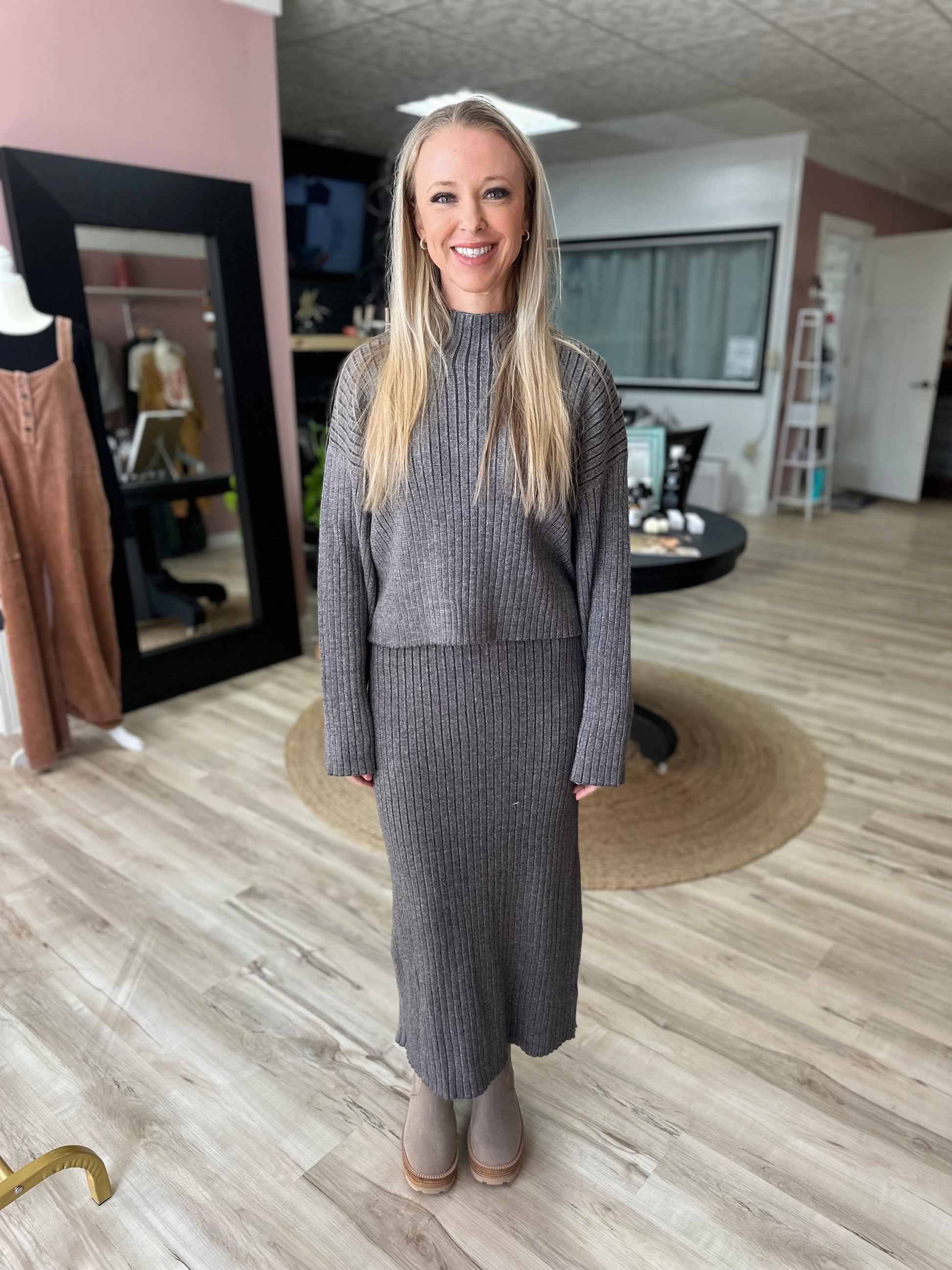 This two-toned ribbed sweater with the matching midi skirt is the perfect ensemble for any wardrobe. Whether it's a day at the office, a night out on the town, or a holiday party. Pairs perfectly with heels or tall boots. Grab yours before they sell out. This is a very popular outfit!