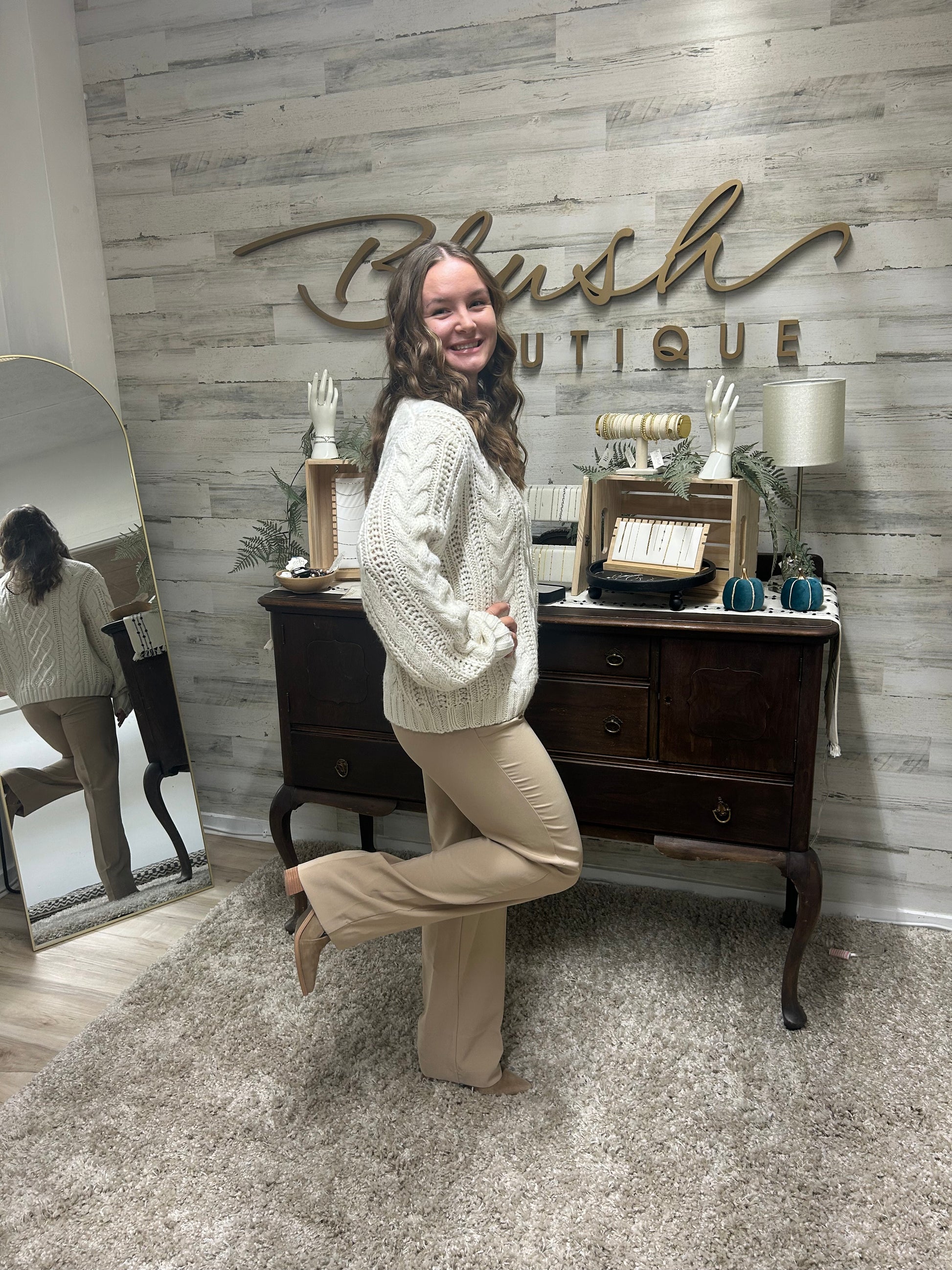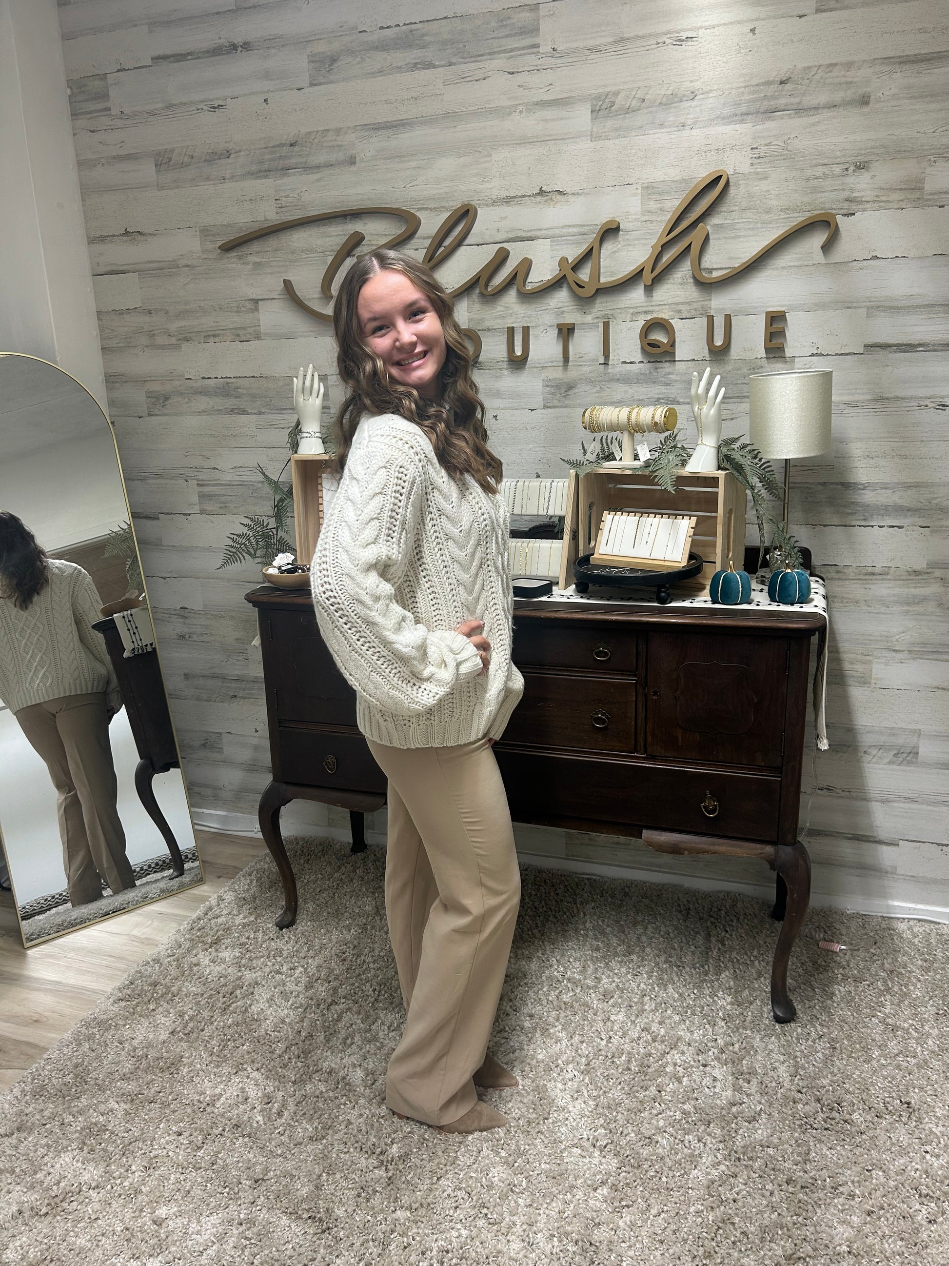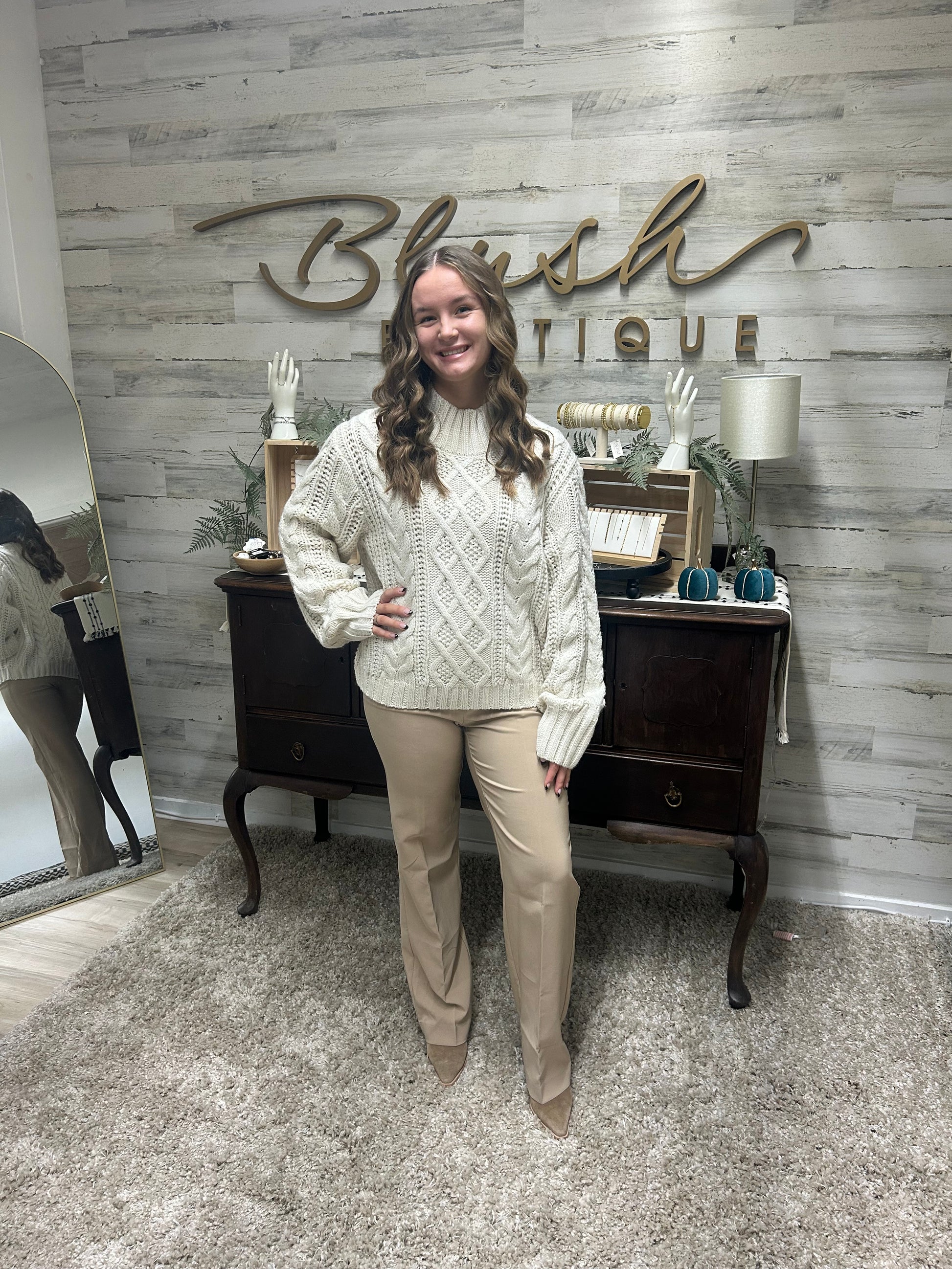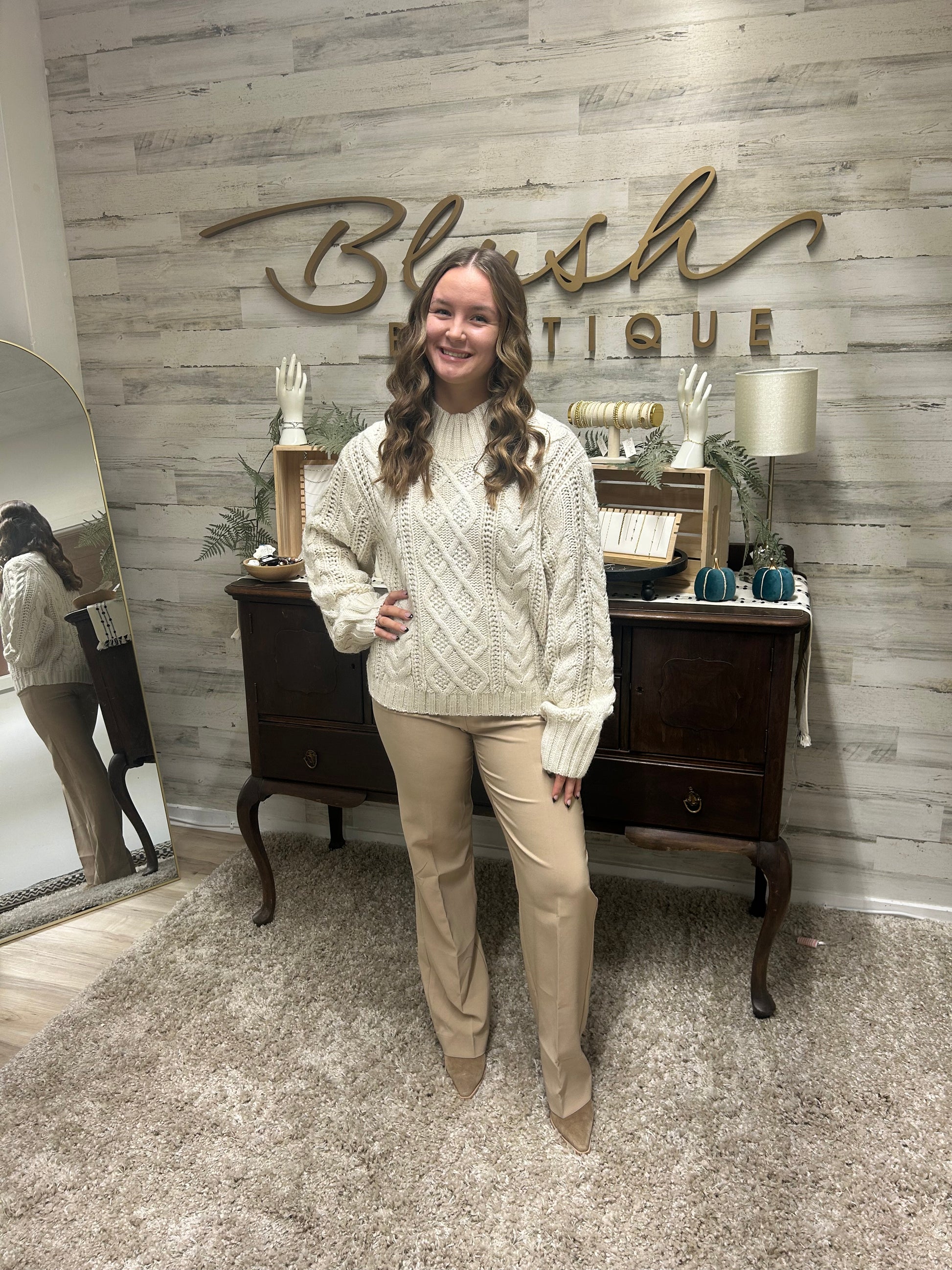 Cozy up in this timeless cable knit sweater — a staple for chilly days! Featuring a thick, textured knit with a relaxed fit and mock neck for effortless comfort and style.